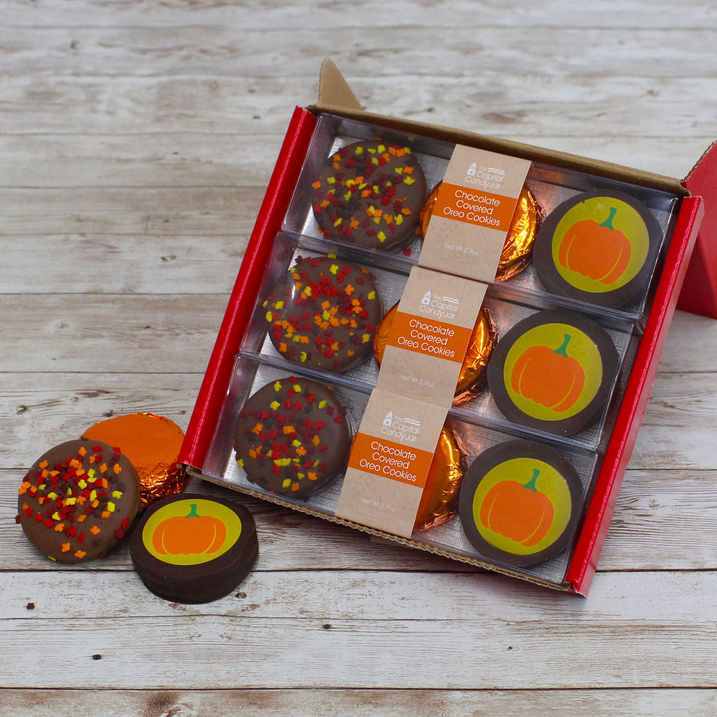 These festive fall themed Oreos are a perfect way to celebrate the changing of the seasons. Each red gift box contains 3 packages of our fall themed chocolate covered Oreos for a total of 9 cookies. Each individual package contains one dark chocolate Oreo cookie decorated with fall leaf sprinkles; one dark chocolate covered Oreo cookie embossed with the image of a pumpkin; and a milk chocolate covered Oreo wrapped in orange foil.