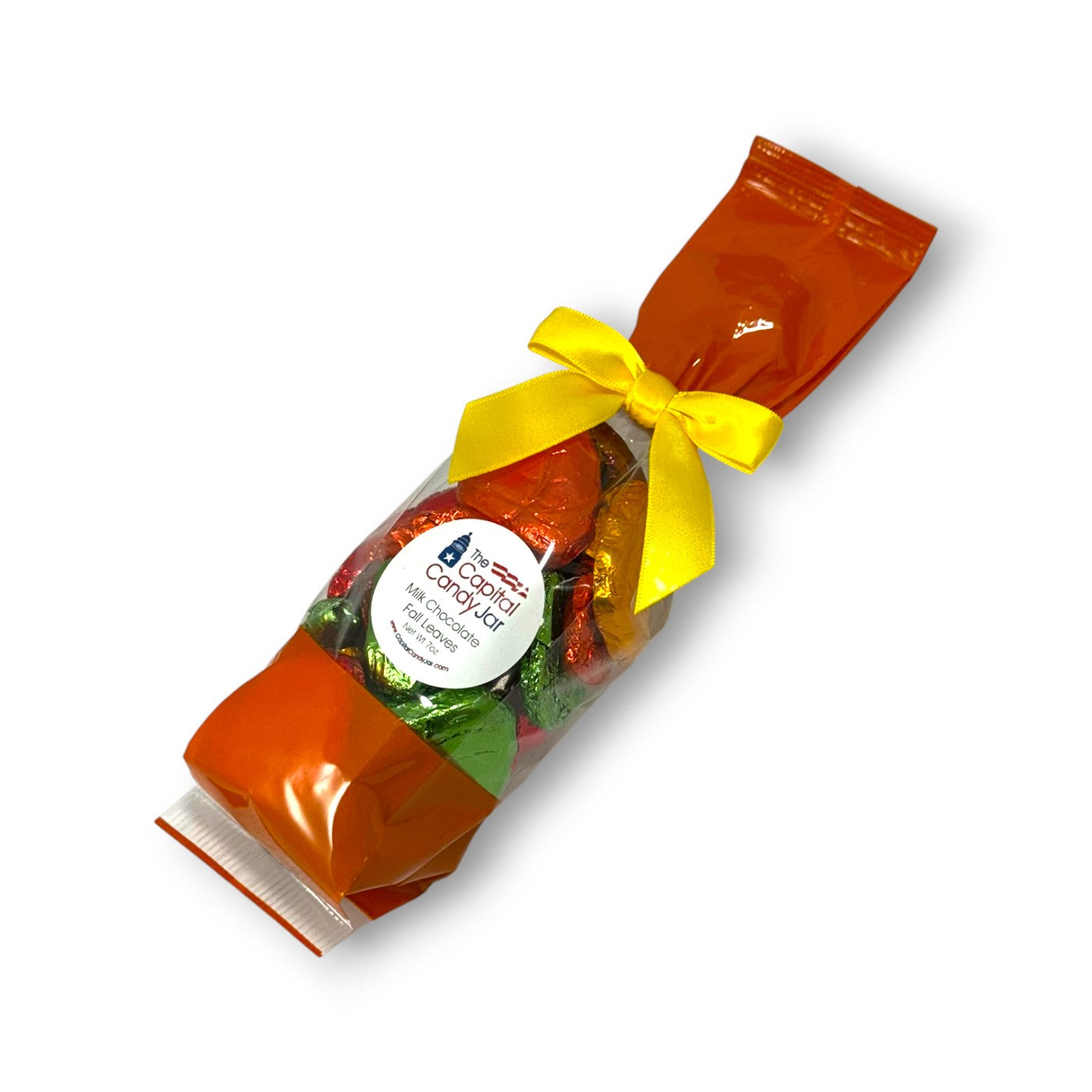 These foil wrapped fall leaves are a great gift or favor for fall parties. They come packaged in an orange bag. Each bag contains 7.5oz of milk chocolate leaves and is tied with a yellow bow.