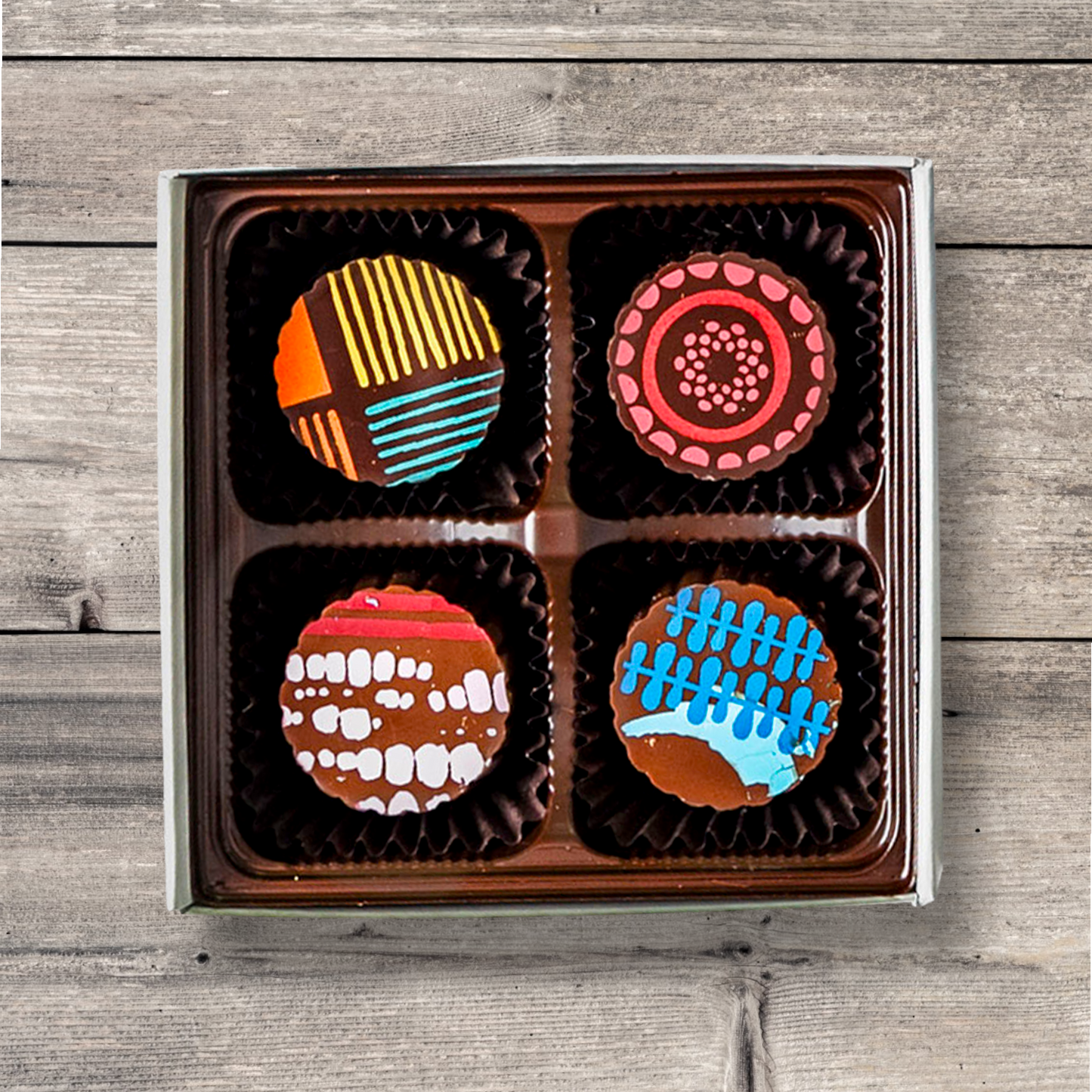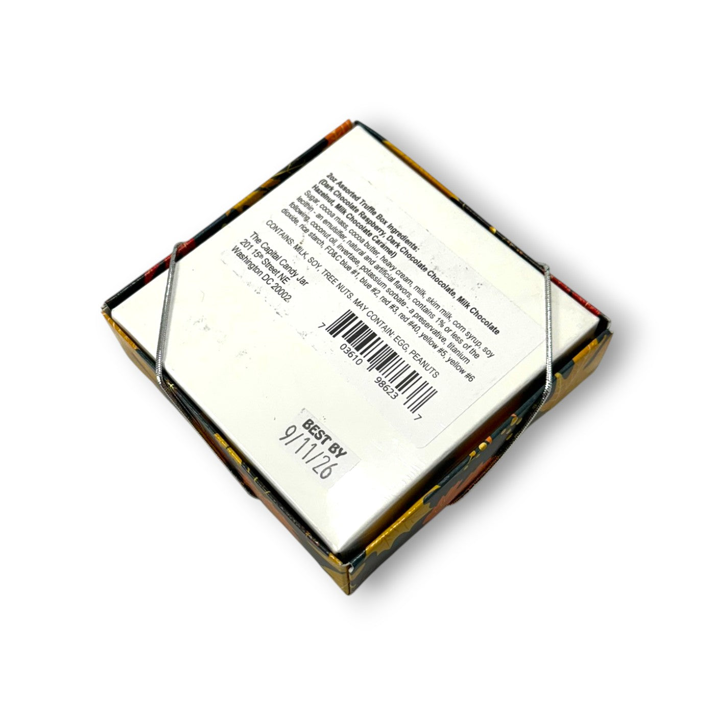 Artisanal truffles make a classy gift option! This 2oz gift box contains 4 chocolate truffles with hard chocolate outer shells and soft flavored ganache centers. Each box contains 1 dark chocolate raspberry truffle, 1 dark chocolate chocolate truffle, 1 milk chocolate caramel truffle, and 1 milk chocolate hazelnut truffle.