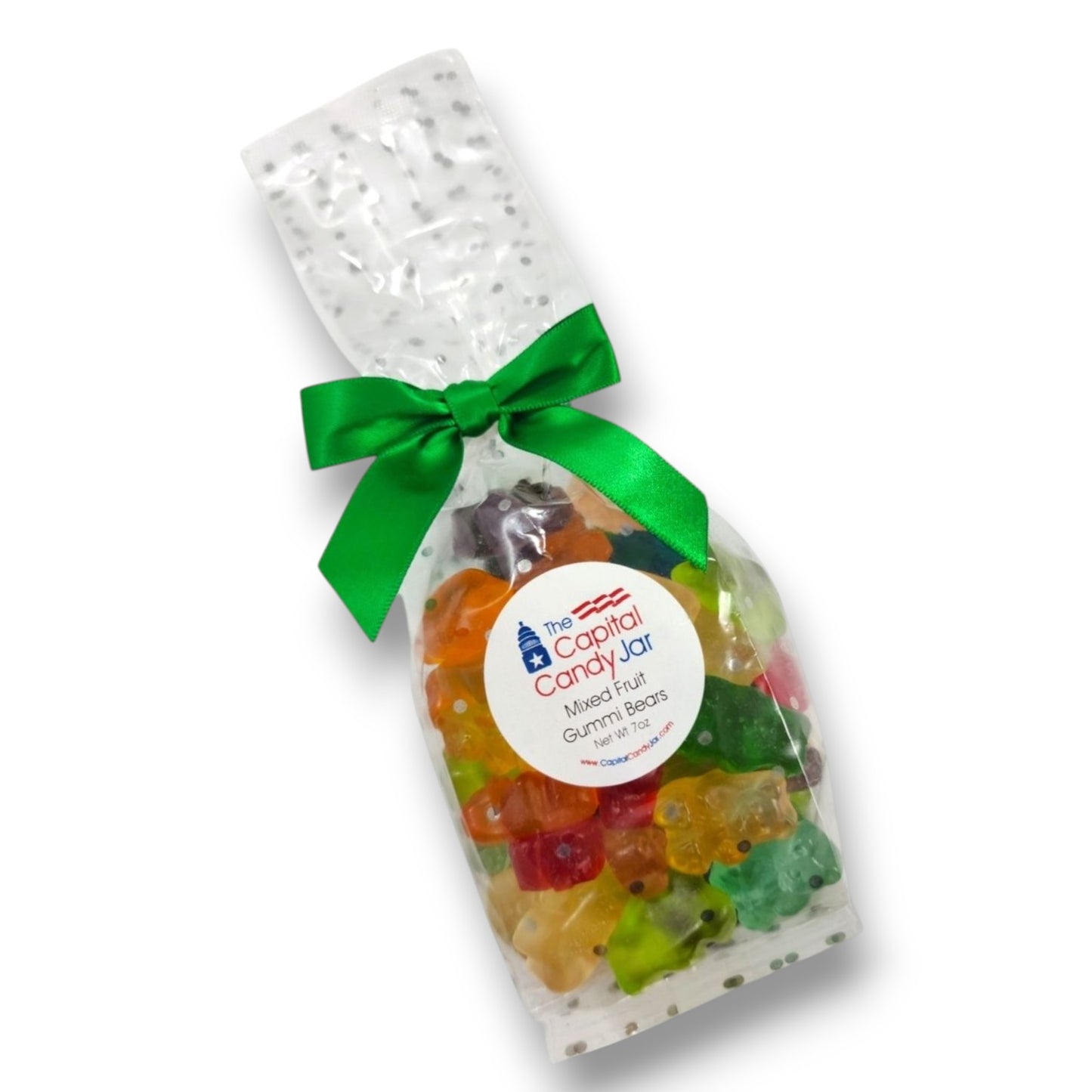 These mixed fruit gummi bears burst with fruit flavor and add some fun to any celebration. Each bag contains a mix of flavors including: cherry, pink grapefruit, watermelon, strawberry, orange, blue raspberry, lime, grape, green apple, mango, pineapple & lemon. They come packaged in a cellophane bag tied with a bow.