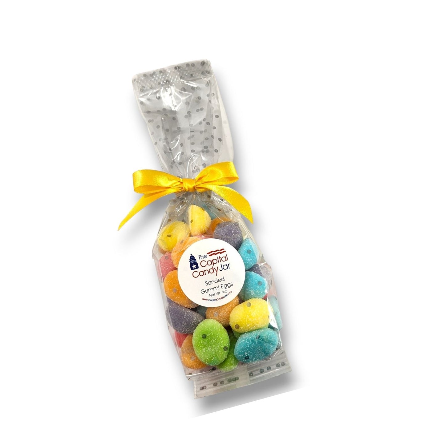 A Capital Candy Jar favorite! These brightly colored gummi eggs are bursting with fruit flavor and sanded with a light coating of sugar. Sealed with a festive yellow bow, it makes a perfect treat for celebrating spring. Each bag contains a an assortment of eggs in blue raspberry, grape, strawberry, orange, green apple, and lemon.