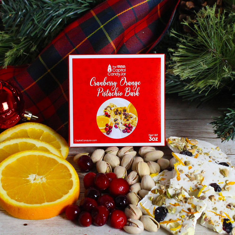 Our customers describe this unique bark by saying "it tastes like Christmas." We start with a layer of smooth creamy white bark that we infuse with orange oil. We top it with dried cranberries, pistachios and a little bit of orange peel. This unique treat will be a huge hit with anyone who receives it.