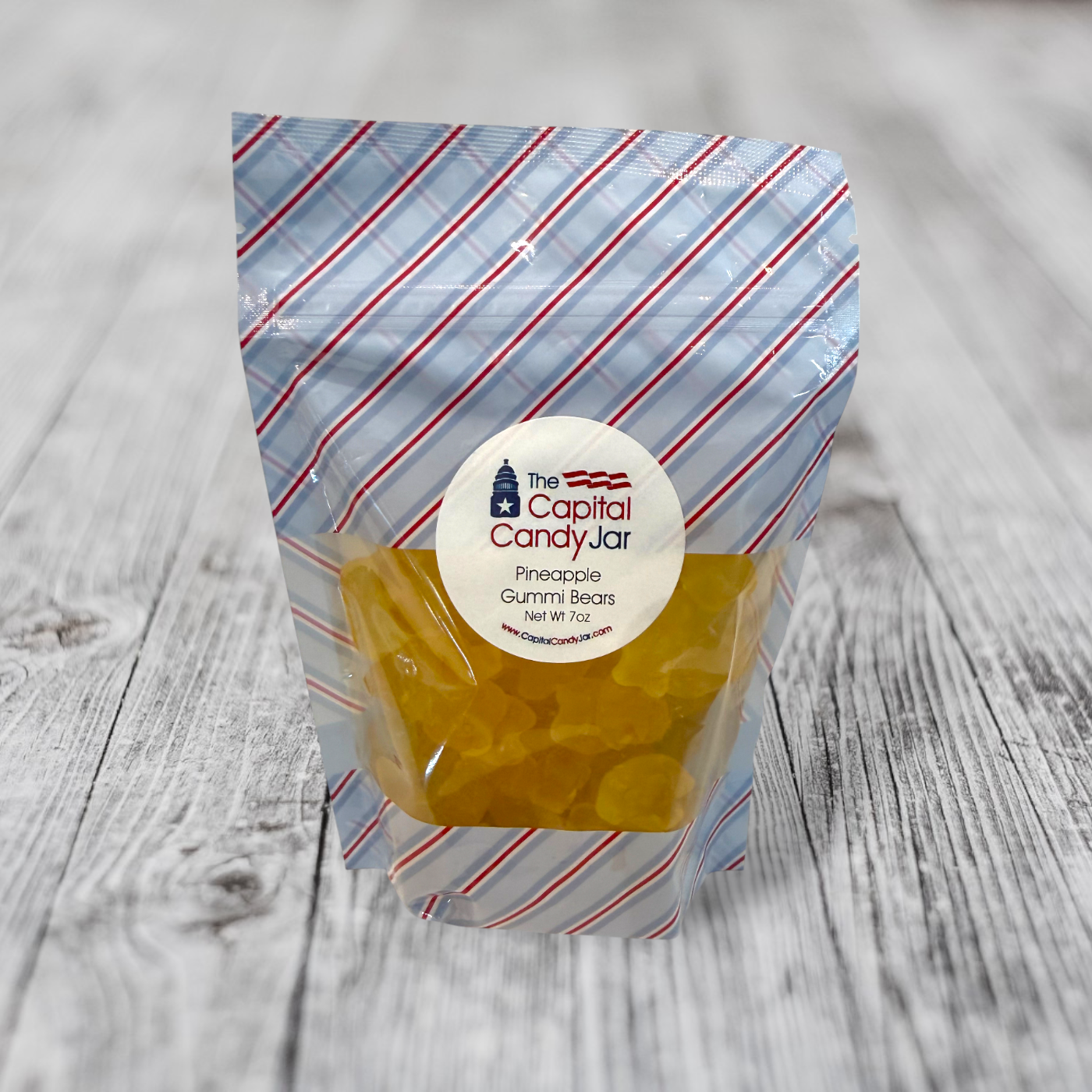 Indulge your sweet tooth with an adorable snack of pineapple flavored gummi bears. Each soft and chewy bear is bursting with juicy, pineapple flavor that'll have your taste buds tingling. Enjoy the natural sweetness of these fruity critters and make your snack time so much more bearable!