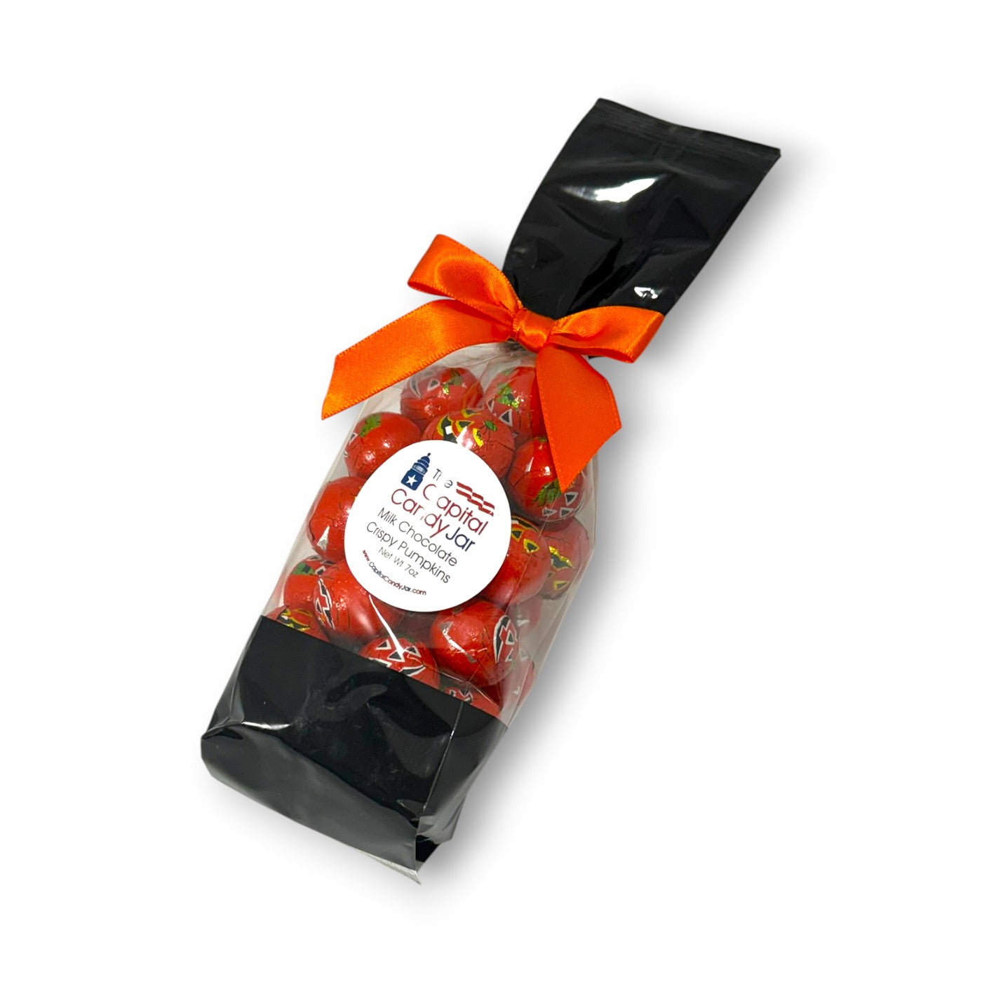 Get ready to have a spooktacular time with these foil covered crispy pumpkin balls! Perfect for Halloween parties, they come in a clear bag adorned with shiny silver polka dots, tied neatly with an orange bow. Treat yourself to these scrumptious, chocolatey, pumpkin shaped goodies.