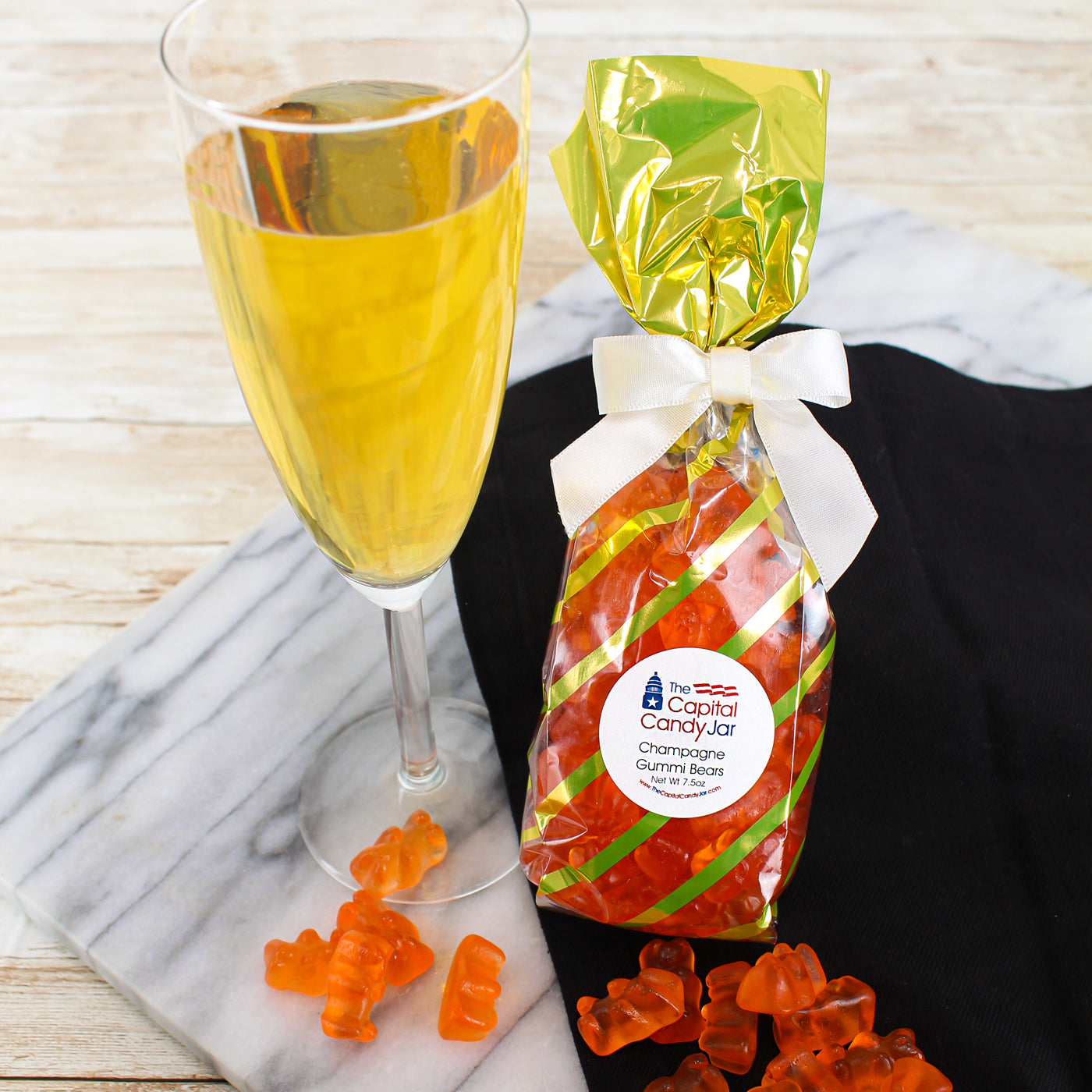 This bag of gummi bears is a great great way to celebrate any special occasion. 7.5oz of champagne flavored gummi bears. They are packaged in a gold striped bag and tied with a white bow.