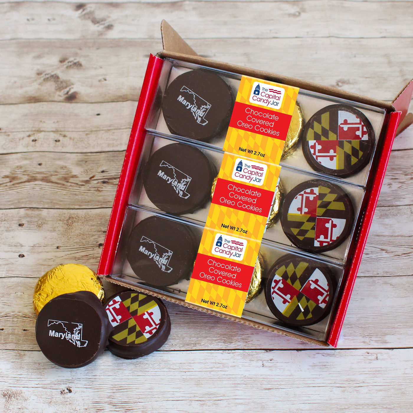 This festive red gift box holds three packs of our Maryland-inspired chocolate covered Oreos, totaling nine delicious cookies. Inside each pack, you'll find a dark chocolate Oreo featuring the Maryland flag in cocoa butter, another dark chocolate Oreo embossed with Maryland’s state outline, and a milk chocolate Oreo wrapped in shiny gold foil. Perfect for a tasty tribute to the Old Line State!